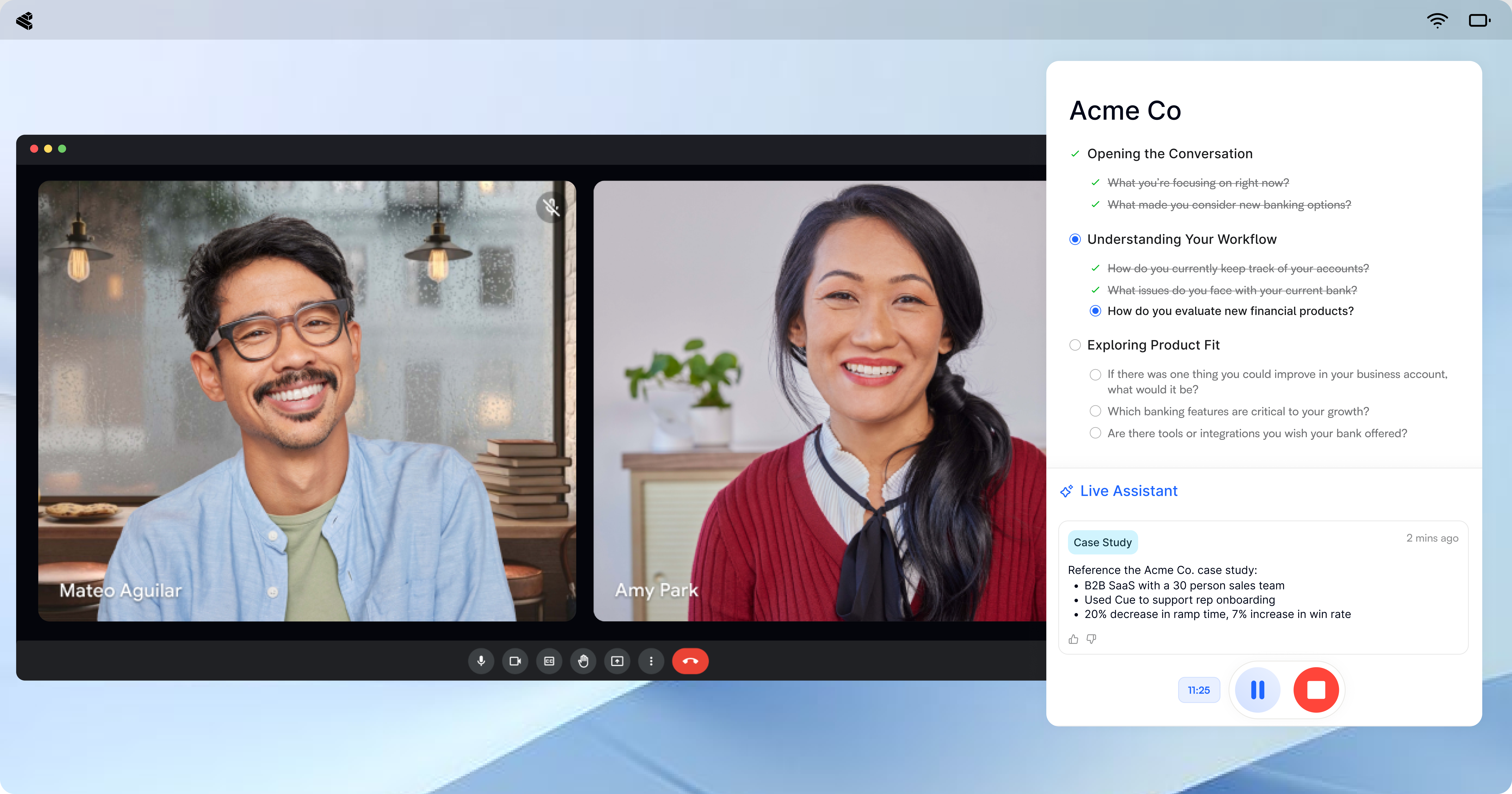 Cue automatically transcribes your call, keeps you on the track, and answers client questions