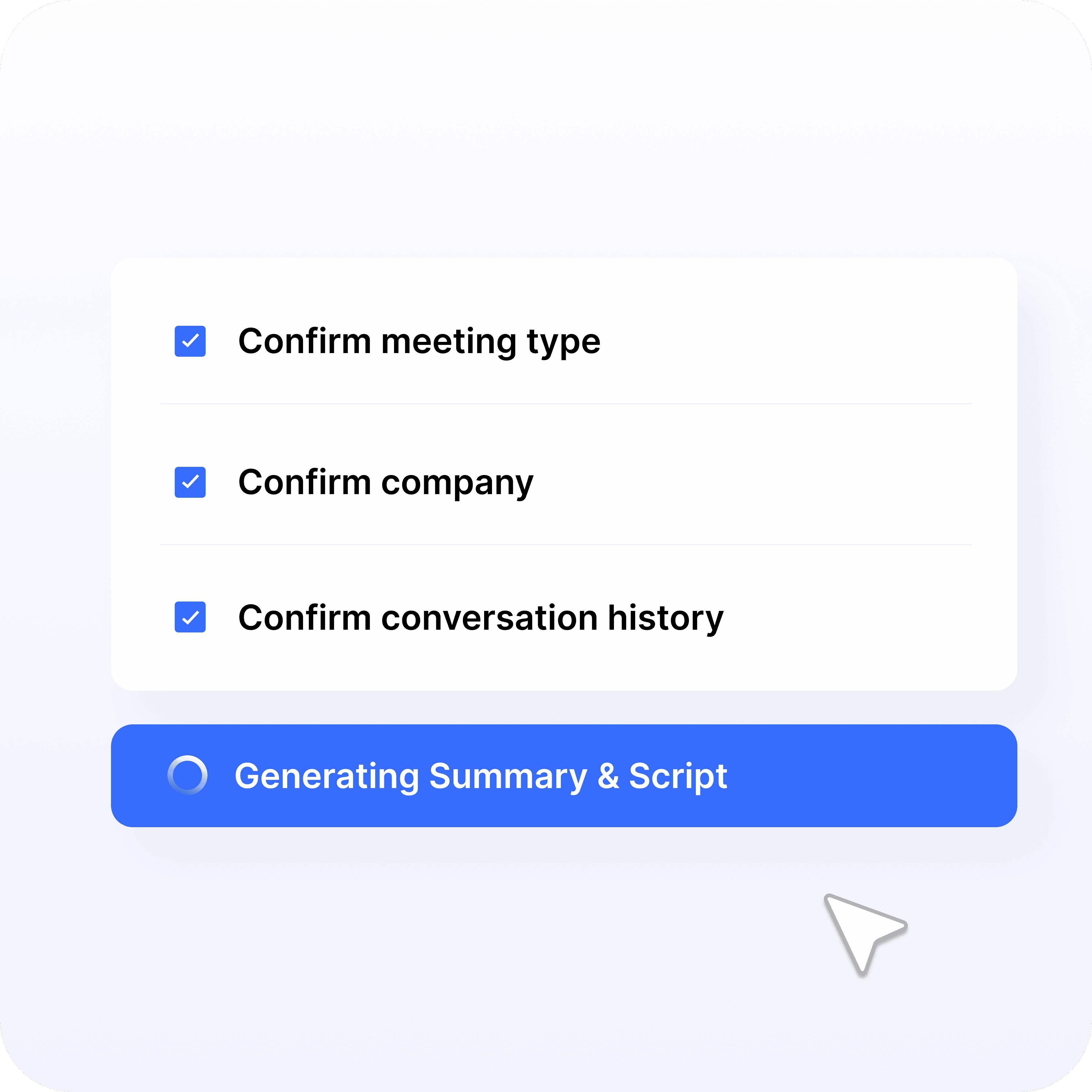 Confirm a few quick details and we generate pre-call summaries and personalised scripts