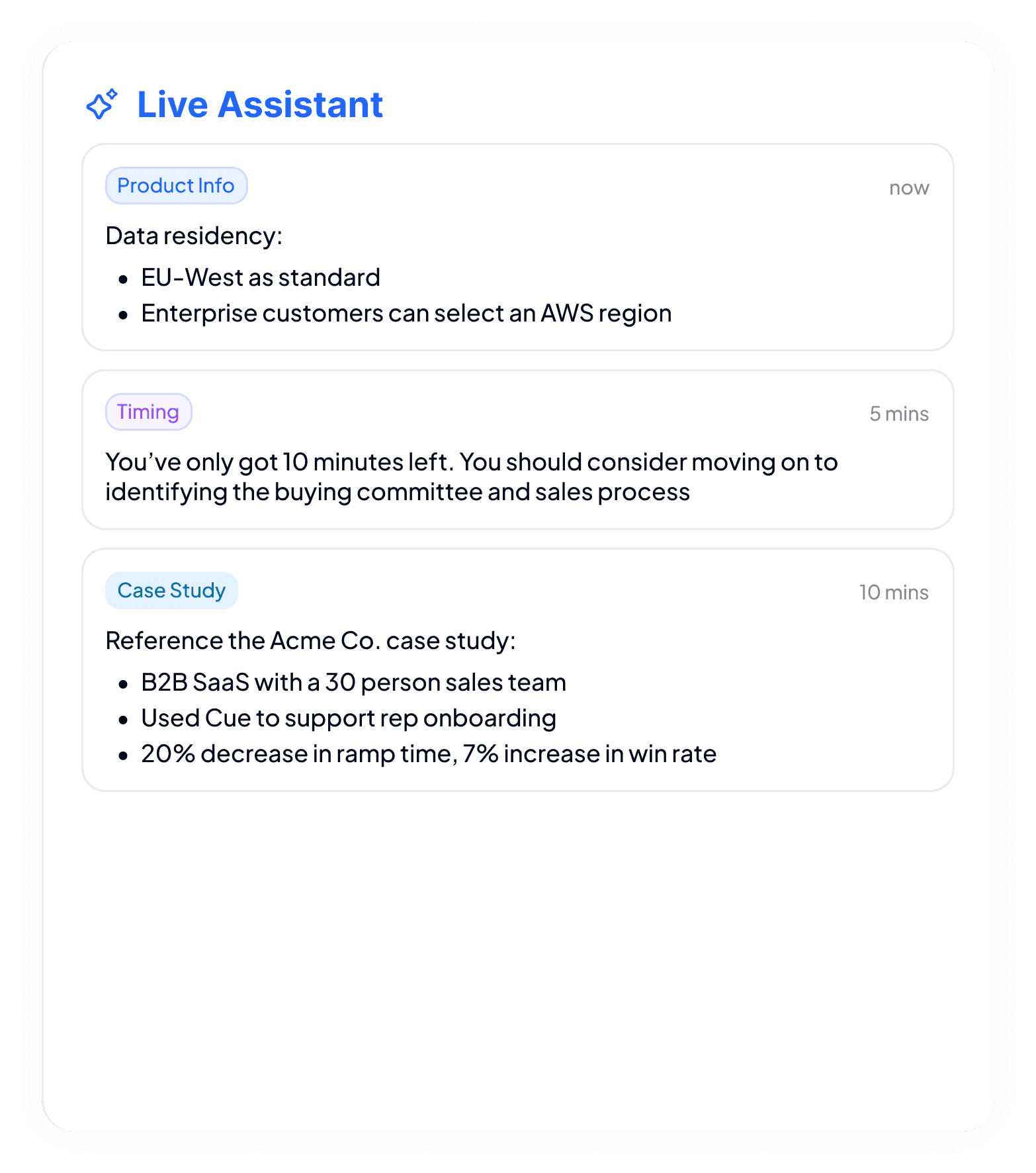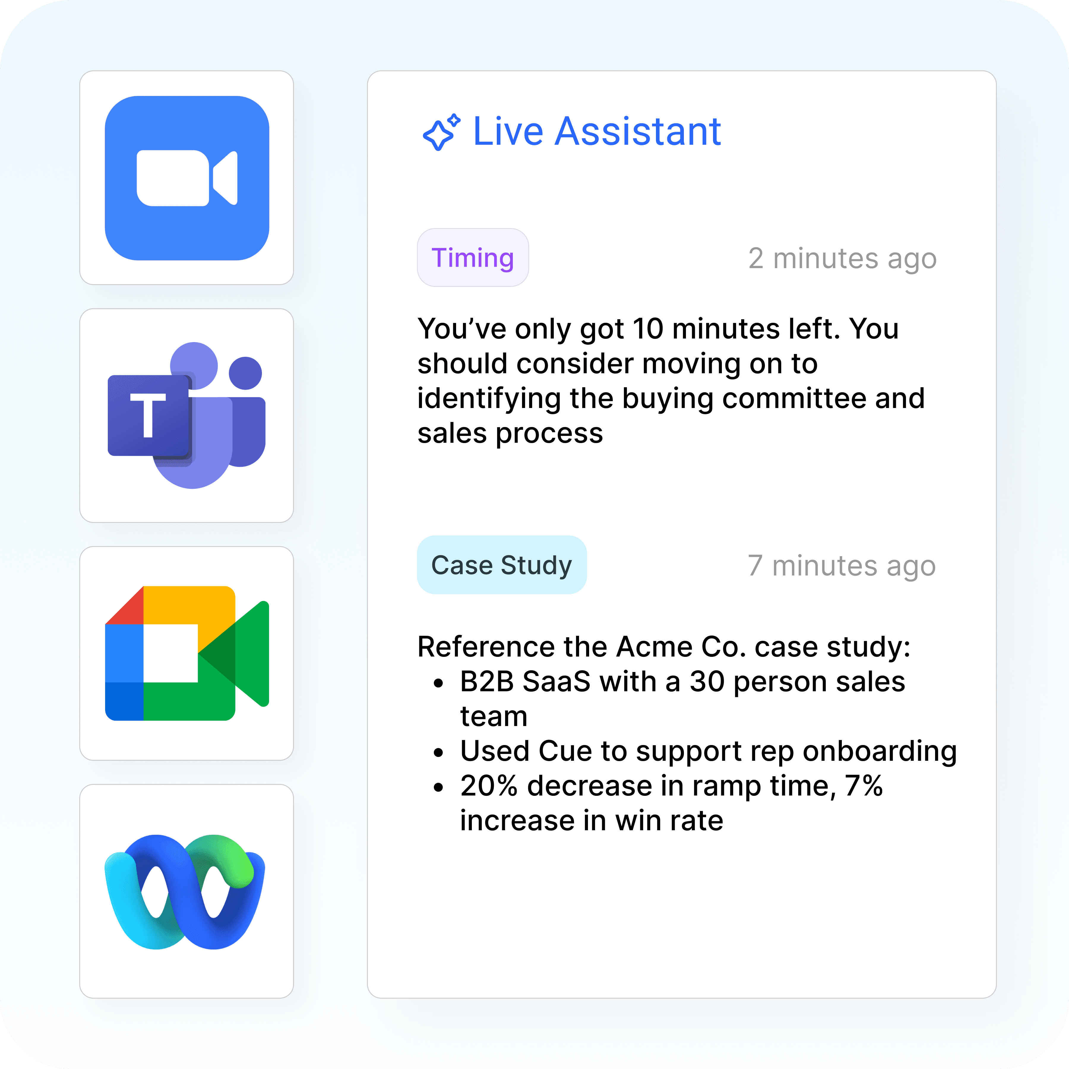 Cue listens to your calls and provides real-time answers and live coaching, without needing to be prompted