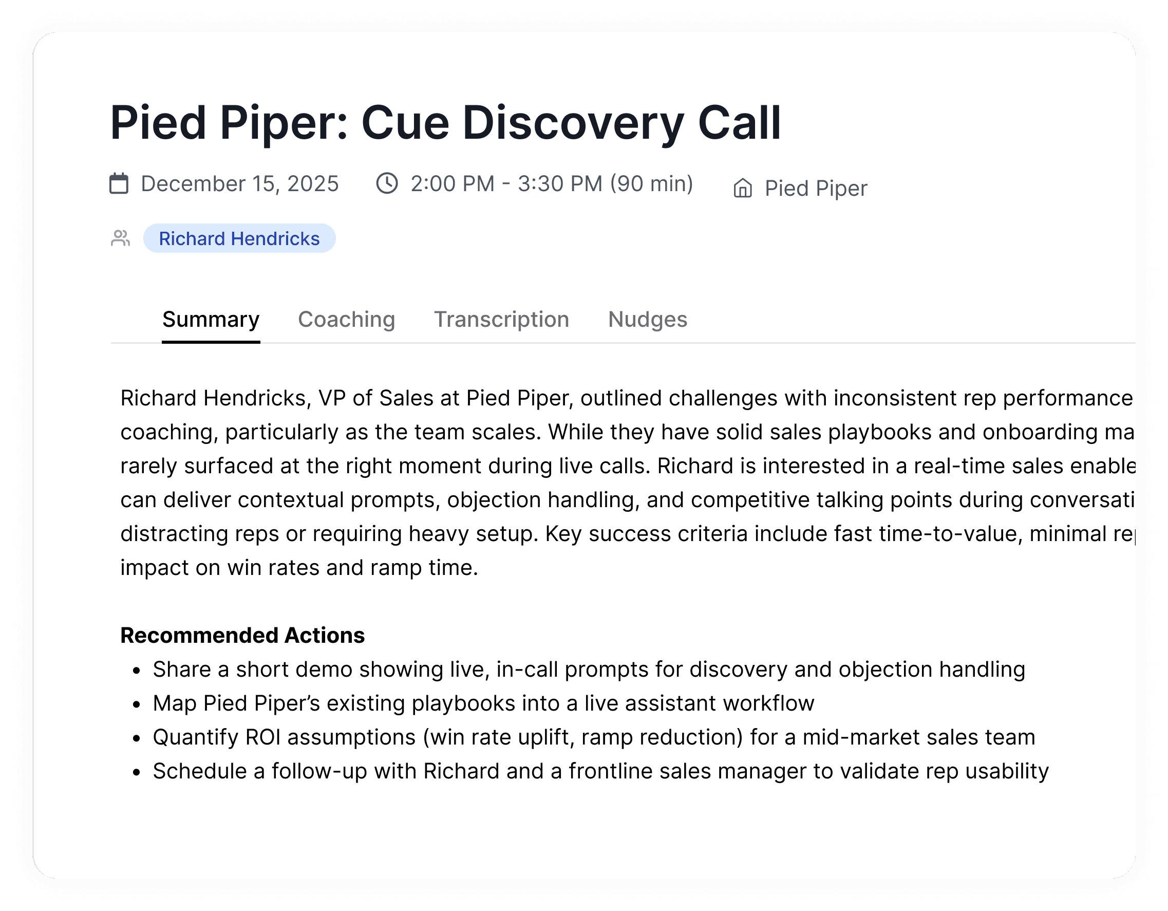 Cue deals with note taking and call summaries, saving you time, and allowing you to focus on the conversation