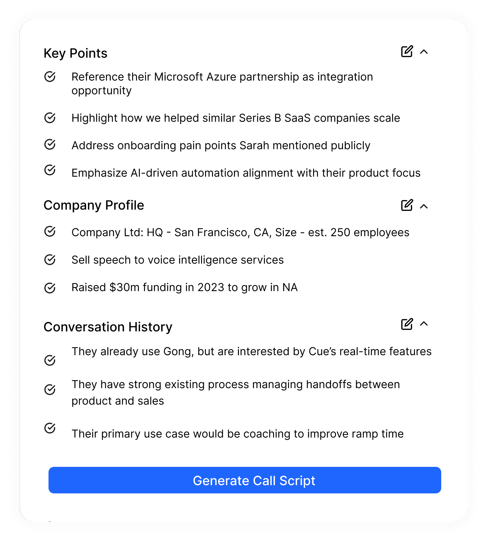 We combine client research, past conversations and knowledge of your product to create pre-call summaries and tailored call scripts
