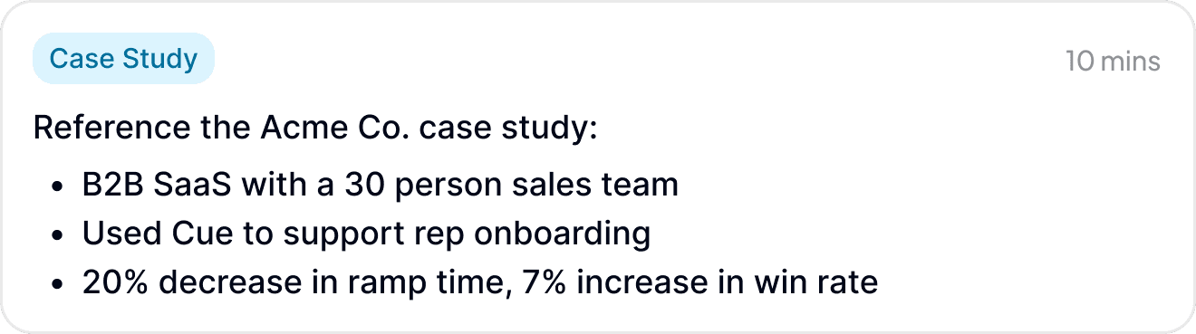 "Cue has been a game changer for SDR onboarding. We've seen ramp times drop, and new reps building positive habits from day 1"